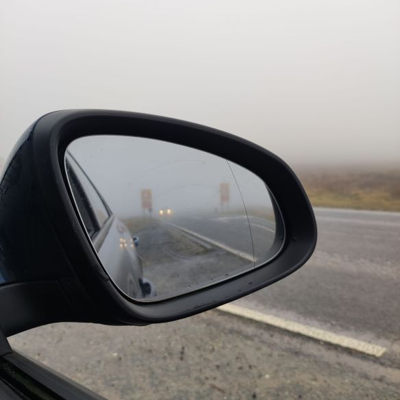 Driving under fog – or so it seems. Cloud skims the roof of the car until the incline takes us up and at it. Into the milk.